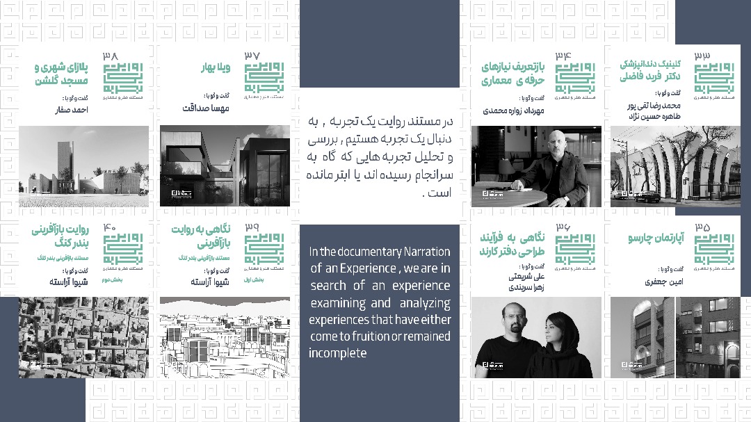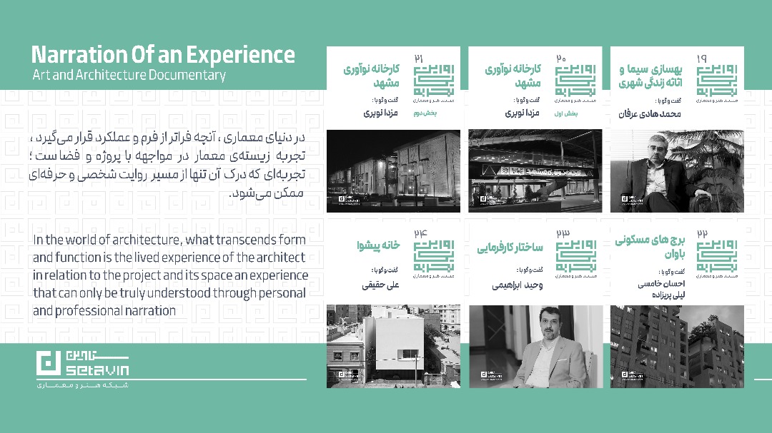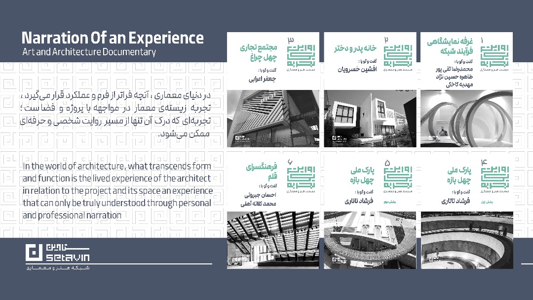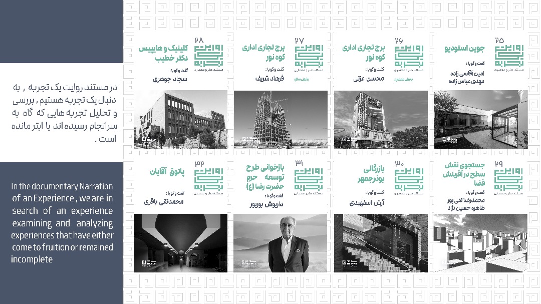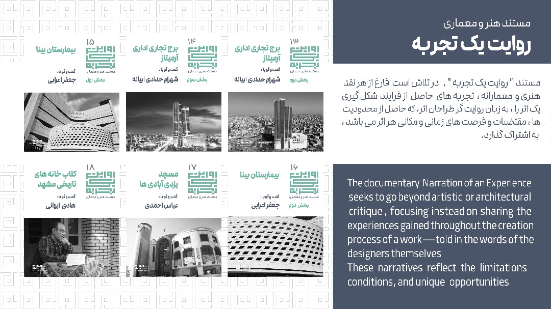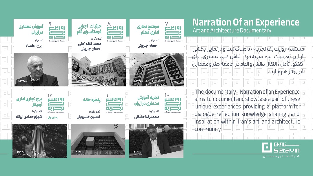مستند ” روایت یک تجربه ” , در تلاش است فارغ از هر نقد هنری و معمارانه ، تجربه های حاصل از فرایند شکل گیری یک اثر را ، به زبان روایت گر طراحان اثر، که حاصل از محدودیتها ، مقتضیات و فرصتهای زمانی و مکانی هر اثر می باشد ، به اشتراک گذارد.