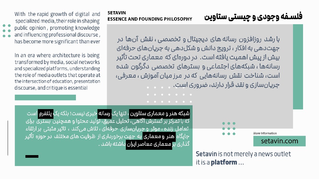 ستاوین تنها یک رسانه خبری نیست؛ بلکه یک پلتفرم است که با تمرکز بر گسترش آگاهی، تحلیل عمیق، تولید محتوا و همچنین بستری برای تعامل زنده ، موثر و جریانسازی حرفهای ، تلاش میکند ، تاثیر مثبتی بر ارتقاءجایگاه هنر و معماری به جهت برخورداری از ظرفیت های مختلف در حوزه تأثیرگذاری بر معماری معاصر ایران داشته باشد .